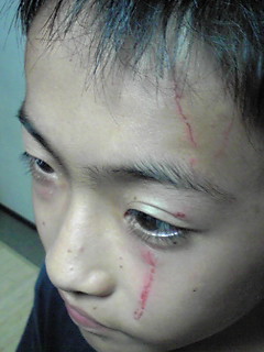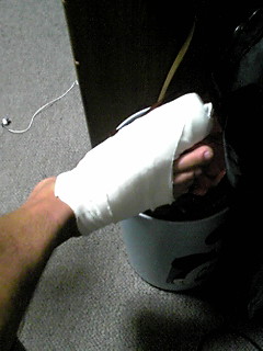 部活で、やられたらしく・・・・。バスケでディフェンスにやられたって。