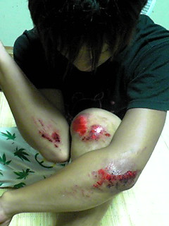 これ、自転車でかぁ? バイクでコケたような感じやけど・・・・。